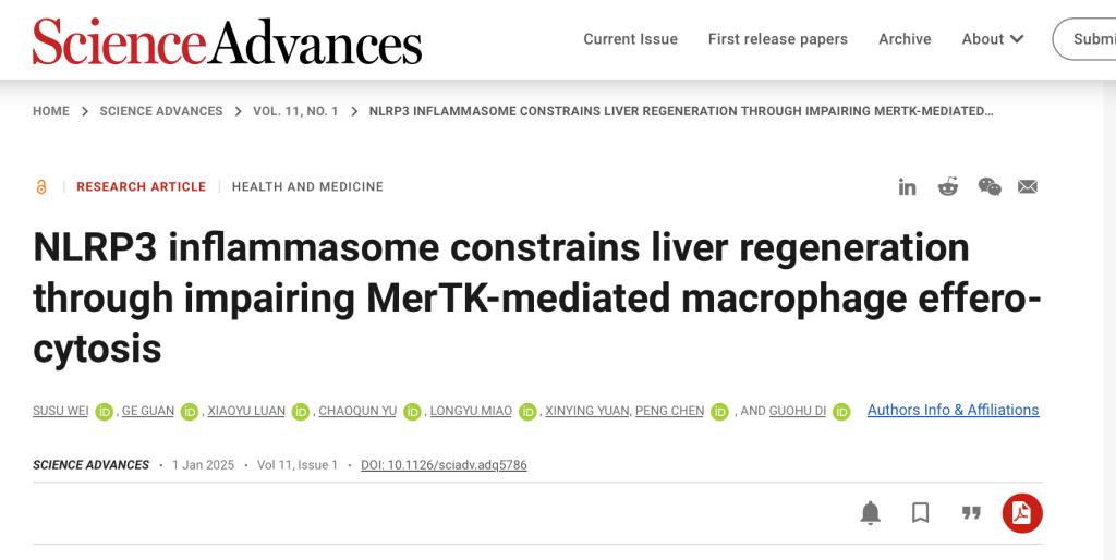狄国虎、陈鹏教授课题组在Science子刊ScienceAdvances杂志在线发表了题为“NLRP3 Inflammasome Constrains Liver Regeneration Through Impairing MerTK Mediated Macrophage Efferocytosis”的研究论文(IF=11.7,DOI: 10.1126/sciadv.adq5786)。该研究揭示了巨噬细胞NLRP3炎症小体在调控肝脏再生中的重要作用,并为靶向NLRP3提供了新的治疗策略。2020级特种医学硕士研究生韦素素(现就职于齐鲁中科现代微生物技术研究院),青岛大学附属医院器官移植中心副主任医师关鸽,2021级特种医学硕士研究生栾晓瑜(现博士就读于中科院遗传与发育生物学研究所),2021级特种医学博士研究生于超群为共同第一作者。6686体育官网