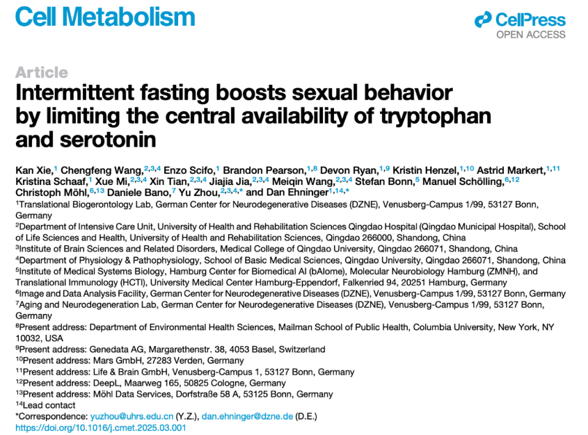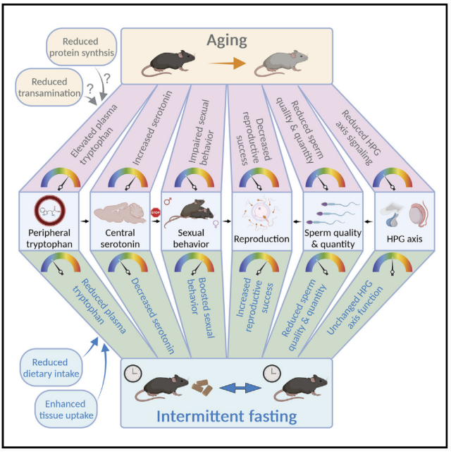 本研究首次揭示间歇性禁食通过降低大脑血清素水平,显著改善老年雄性小鼠的性行为和生殖成功率,为饮食干预改善年龄相关性欲减退提供了新思路。衰老不仅会带来机体功能的逐渐退化,也会对男性生殖能力产生负面影响。随着年龄增长,男性不仅面临着睾酮水平下降、精子质量降低等生理变化,还常常出现性欲减退的问题。近年来,越来越多的研究关注如何通过饮食干预改善衰老带来的生殖功能障碍,而间歇性禁食作为一种简便有效的膳食调控手段,其潜在的生理调节作用正逐渐被揭示出来。