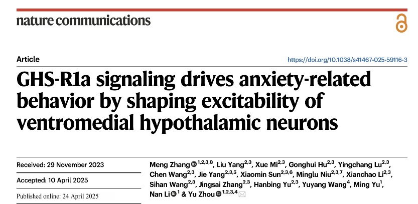 近日,我院生理学专业2020级博士研究生张萌以第一作者在Nature Communications(IF=14.7,中科院1区top)发表题为“GHS-R1a signaling drives anxiety-related behavior by shaping excitability of ventromedial hypothalamic neurons.”的研究论文,我院生理学专业2021级在读博士研究生杨柳和2017级硕士研究生弭雪也对本研究有重要贡献。6686体育官网