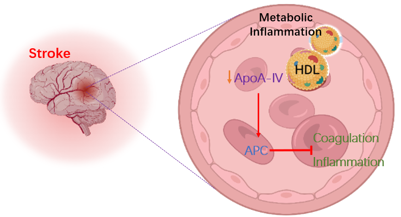凝血与炎症、脂质代谢紊乱密切相关,但这些与凝血调节的关键通路仍不完全清楚。本研究发现,在深静脉血栓患者的血浆中,载脂蛋白ApoA-IV水平下调。ApoA-IV通过增强活化的蛋白C(APC)的抗凝和抗炎活性,从而实现其对凝血、止血和血栓形成的抑制作用。血栓弹力图谱分析显示ApoA-IV显著延长凝固和反应时间,降低血栓凝固角和最大振幅。ApoA-IV抗体可以促进凝血和止血,缩短活化部分凝血活酶时间,并且增加小鼠缺血再灌注损伤的严重程度,而ApoA-IV蛋白则显著延长出血时间和活化部分凝血酶时间。值得注意的是,介导ApoA-IV-APC相互作用的关键区域位于APC蛋白酶结构域的外结合位点144-148残基,且根据互作精细位点设计的靶向多肽HE5可以干扰ApoA-IV对APC活性的增强作用,同时逆转ApoA-IV对小鼠出血时间的延长作用。此外,HE5可以有效地抵消ApoA-IV增强APC诱导的蛋白酶激活受体PAR1通路的抗炎作用。总之,该研究揭示了ApoA-IV在凝血、止血和血栓形成过程中的全新作用机制,以及代谢炎症与凝血之间的相互关系,为缺血性脑卒中的治疗提供了新的靶点和策略。