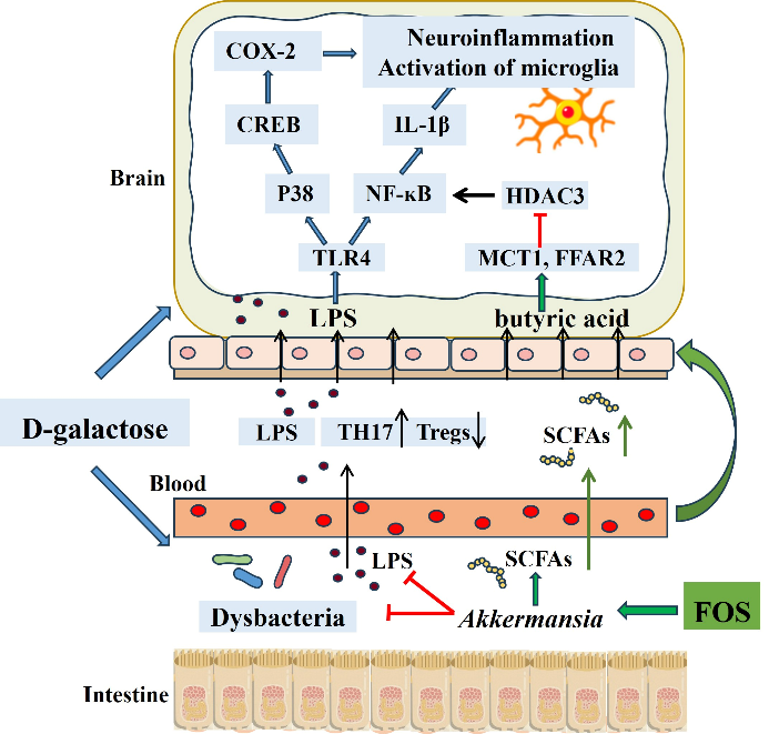 本研究探讨硫酸岩藻低聚糖(FOS)对D-半乳糖诱导的衰老小鼠模型的神经保护作用。FOS通过调节丁酸/HDAC3和LPS/TLR4/NF-ĸB对D半乳糖诱导的神经炎症有改善作用,并进一步下调衰老小鼠的P38/CREB/COX-2炎症通路。FOS减轻D-半乳糖诱导的肠屏障损伤,抑制内毒素血症, 并增加丁酸水平。FOS还提高了肠道菌群的多样性,促进了Akkermansia菌属的显著富集。FOS处理小鼠的粪便微生物群移植在抑制神经炎症和减少D-半乳糖诱导的认知功能障碍方面显示出与FOS治疗相似的效果。提示FOS可通过肠-脑轴减少小胶质细胞激活和神经炎症,发挥神经保护作用。